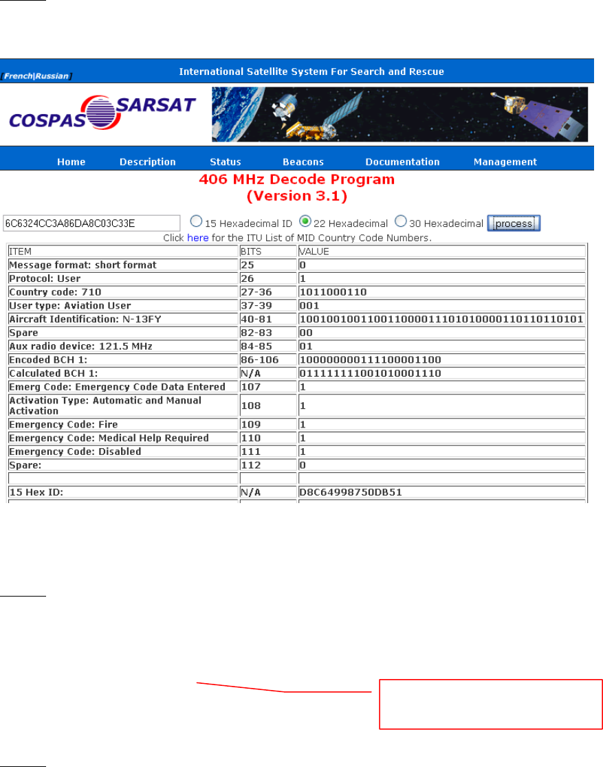 Input the 22-digit hex code into the 406 MHz Decode Program provided. See below: