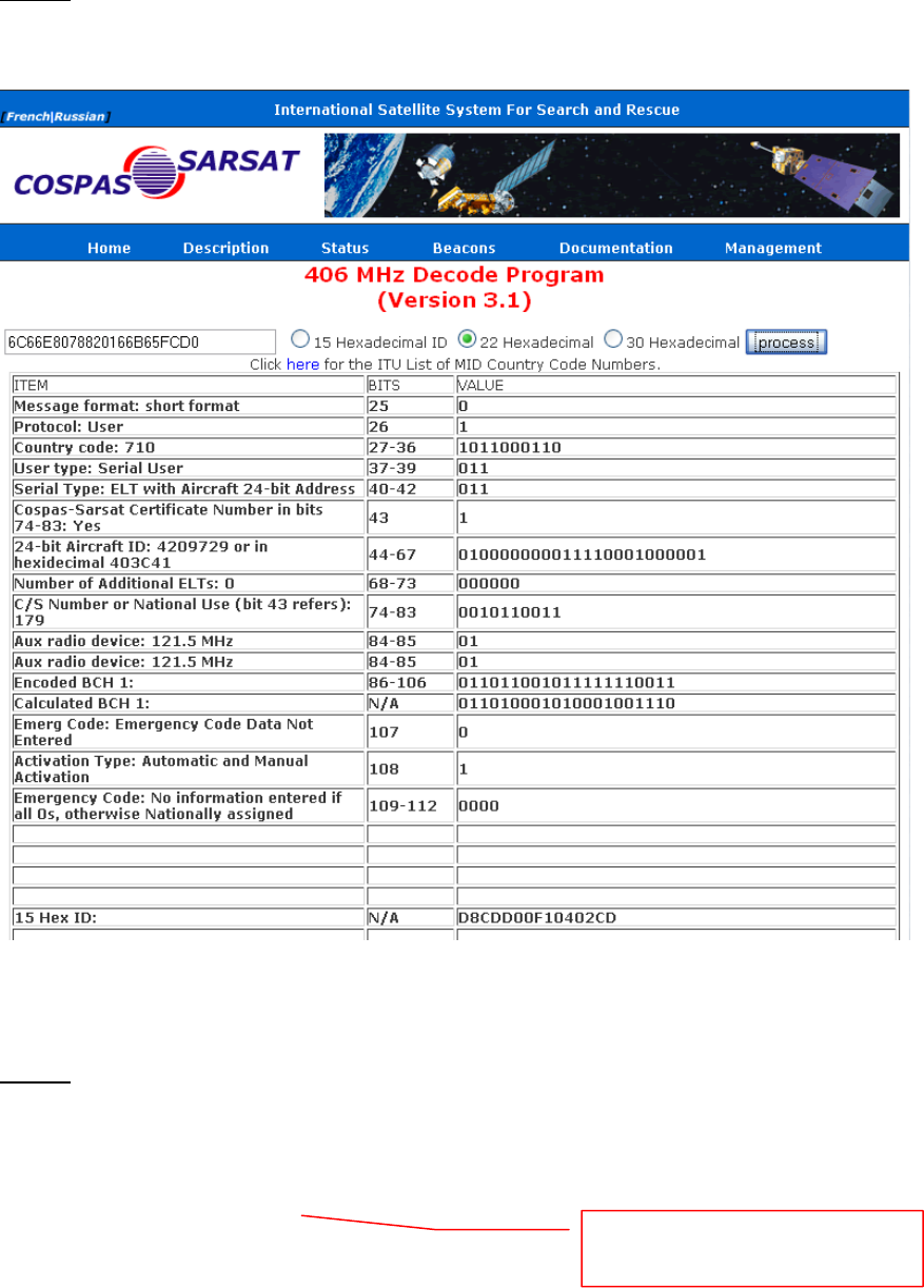 Input the 22-digit hex code into the 406 MHz Decode Program provided. See below: